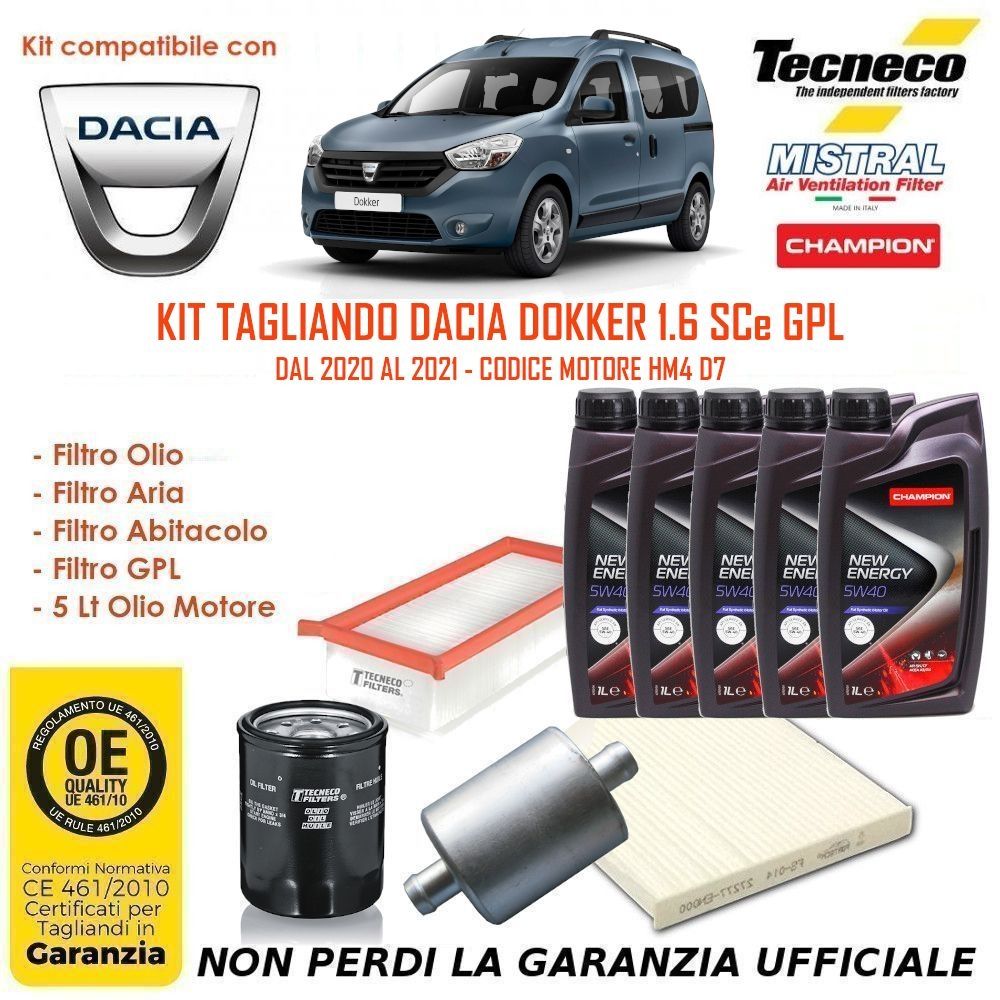 KIT TAGLIANDO 4 FILTRI + OLIO DACIA DOKKER 1.6 SCe GPL 110CV 80KW H4M 2020>2021