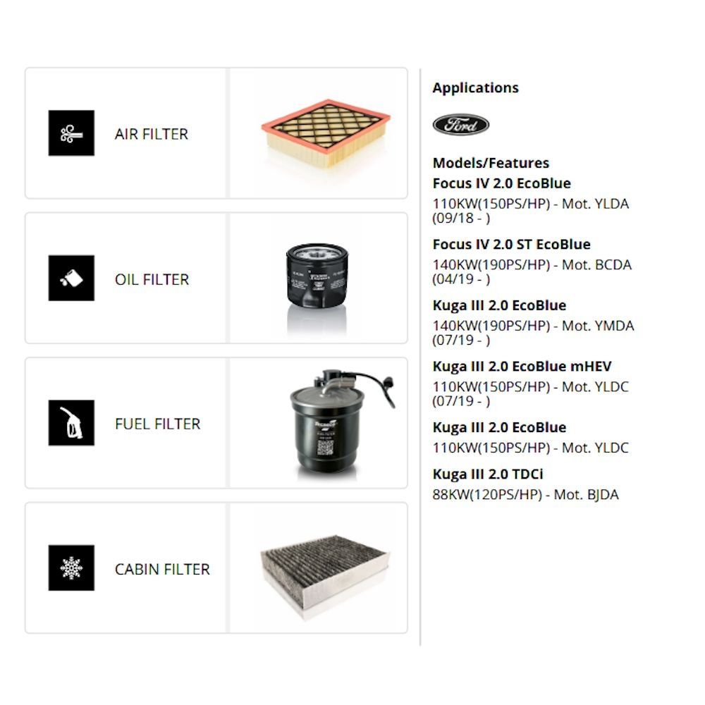KIT TAGLIANDO 4 FILTRI PER FORD FOCUS 2.0 ECOBLUE 190CV 2019-2021 COD. MOT. BCDA