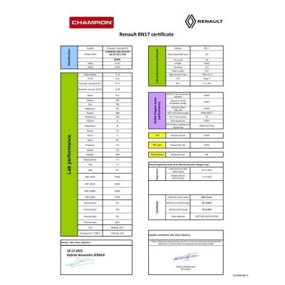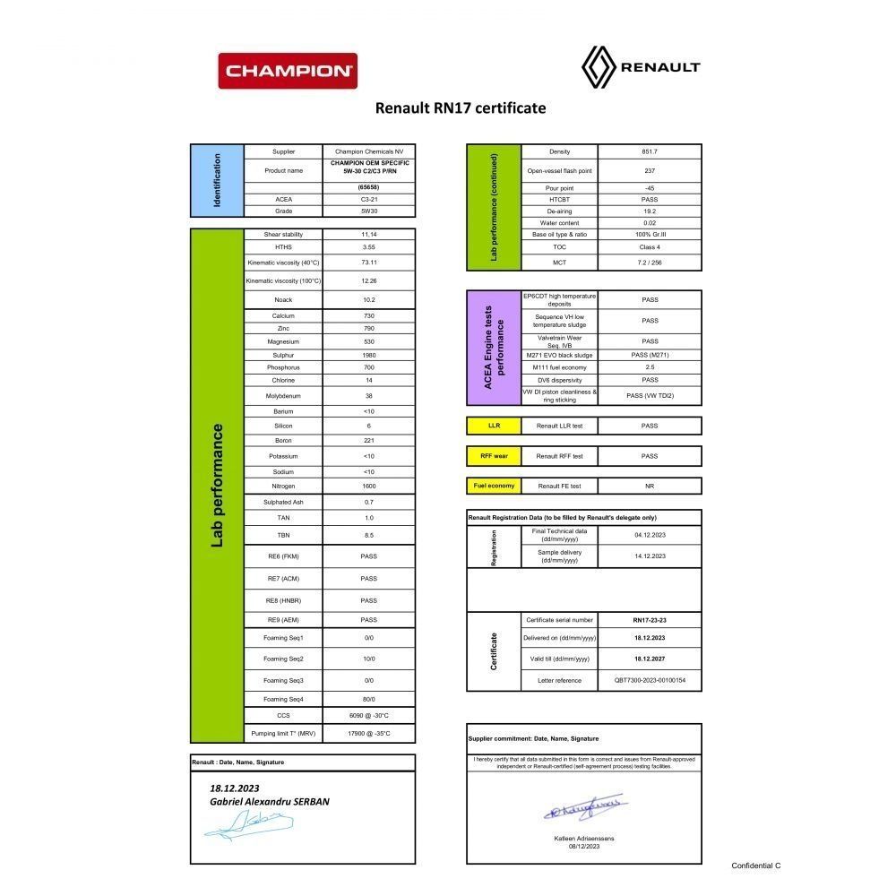 6 LITRI OLIO MOTORE - MARCA CHAMPION OEM SPECIFIC 5W30 C2 C3 CON SPECIFICA RN17