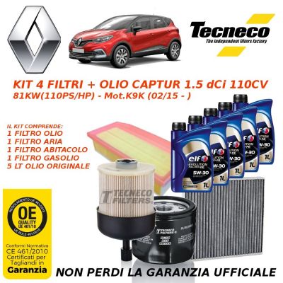 TAGLIANDO 4 FILTRI + OLIO ELF RENAULT CAPTUR 1.5 dCi 110CV dal 02/2015 K9K